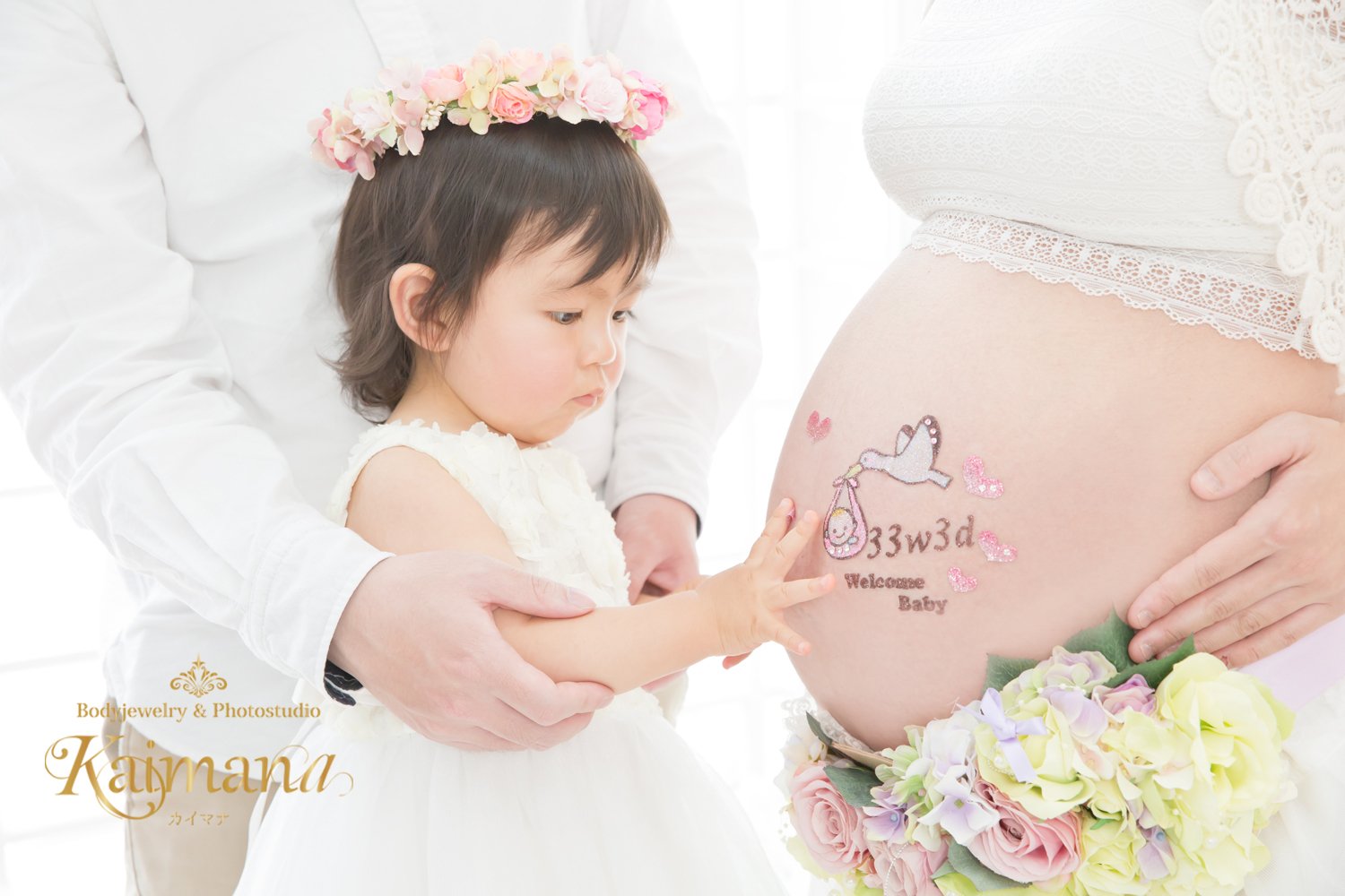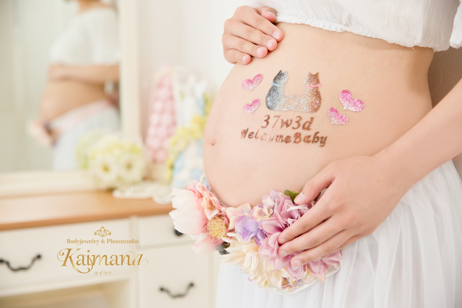マタニティフォトは神秘的。でもKaimanaはとにかく「かわいい」にこだわって撮っています。お腹の中の赤ちゃんが大きくなった時に一緒に「このお腹にいたんだよ」って見てほしいから。