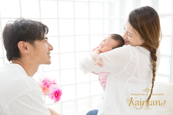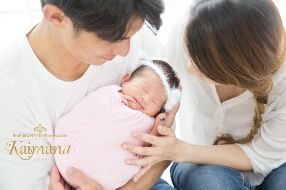 パパとママに見守られて♪ニューボーンフォトはご家族写真も撮影します。